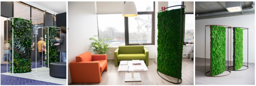 - 지디바이더(G-Divider) : 타원형 금속 프레임에 이끼로 덮인 패널이 배치된 공간 분리용 제품입니다. 개방형 사무실, 리셉션 구역, 대형 회의실, 로비 등에 적합합니다.