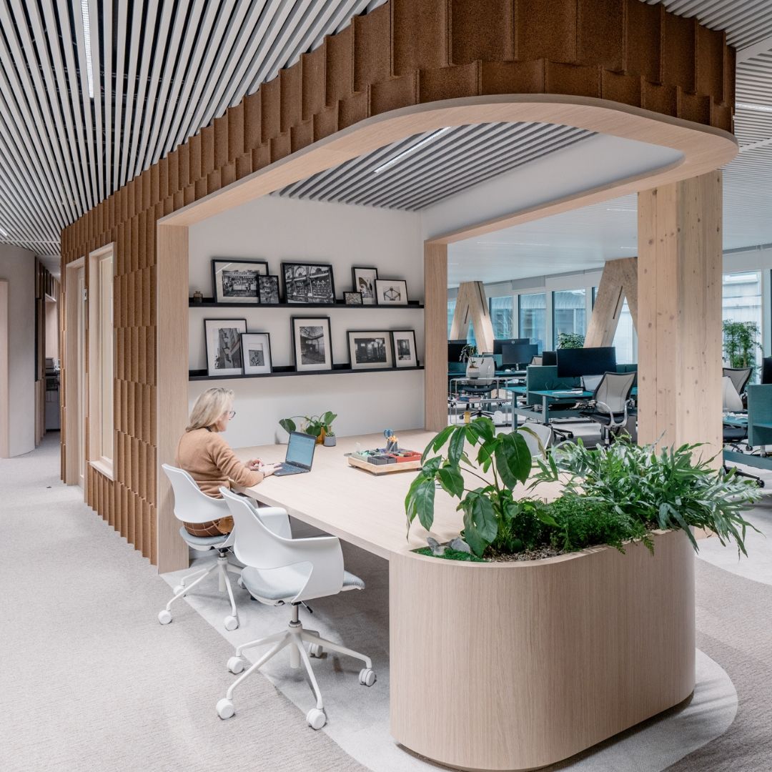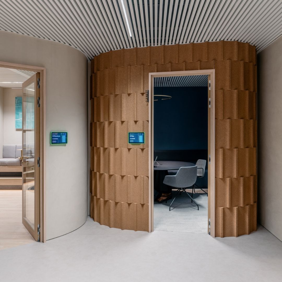 그린무드 Cork Tiles Parenthese로 마감된 오피스의 룩이 기존에 볼 수 없었던 느낌을 살려줍니다.